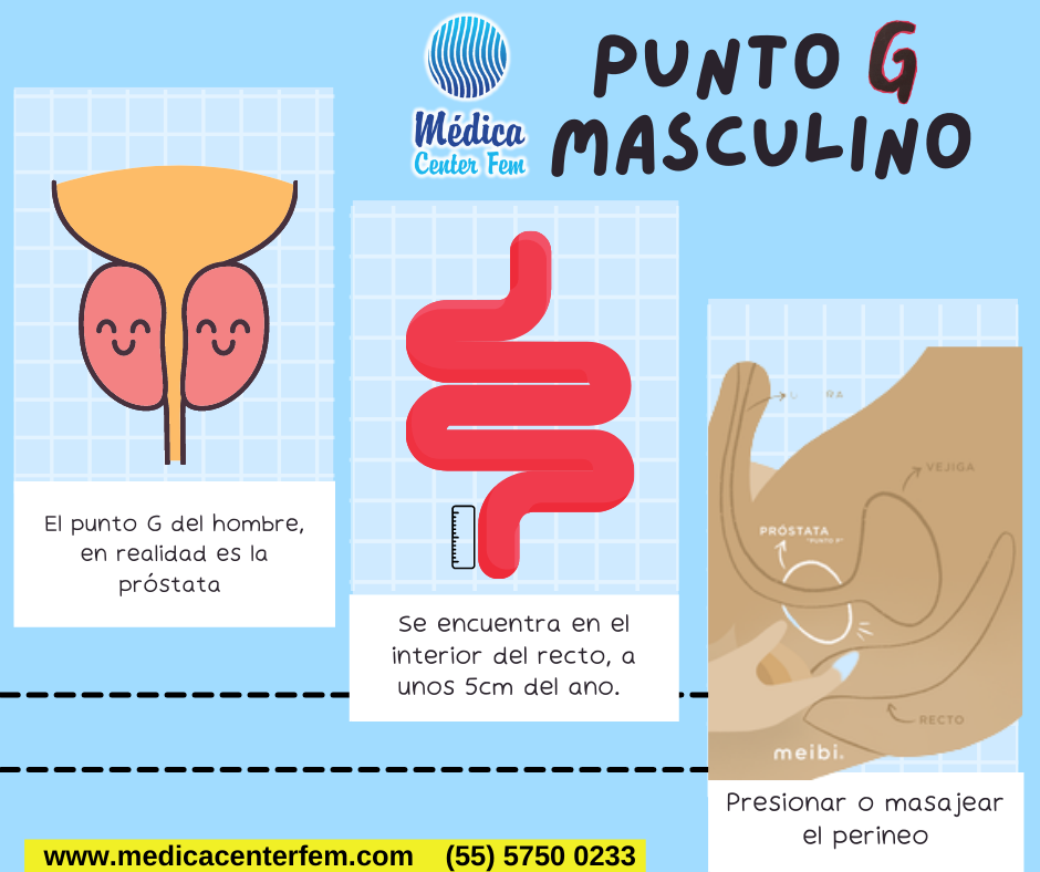 - Punto G masculino: El punto G se localiza en el interior del recto, aproximadamente a unos 5 cm del orificio anal, sin duda uno de los mayores tabúes es lo relacionado al sexo anal, y sobre todo cuando se habla de hombres heterosexuales, pero la realidad es que el sexo anal puede dar muchísimo placer al hombre, aunque es algo que muy pocos se animan a experimentar.