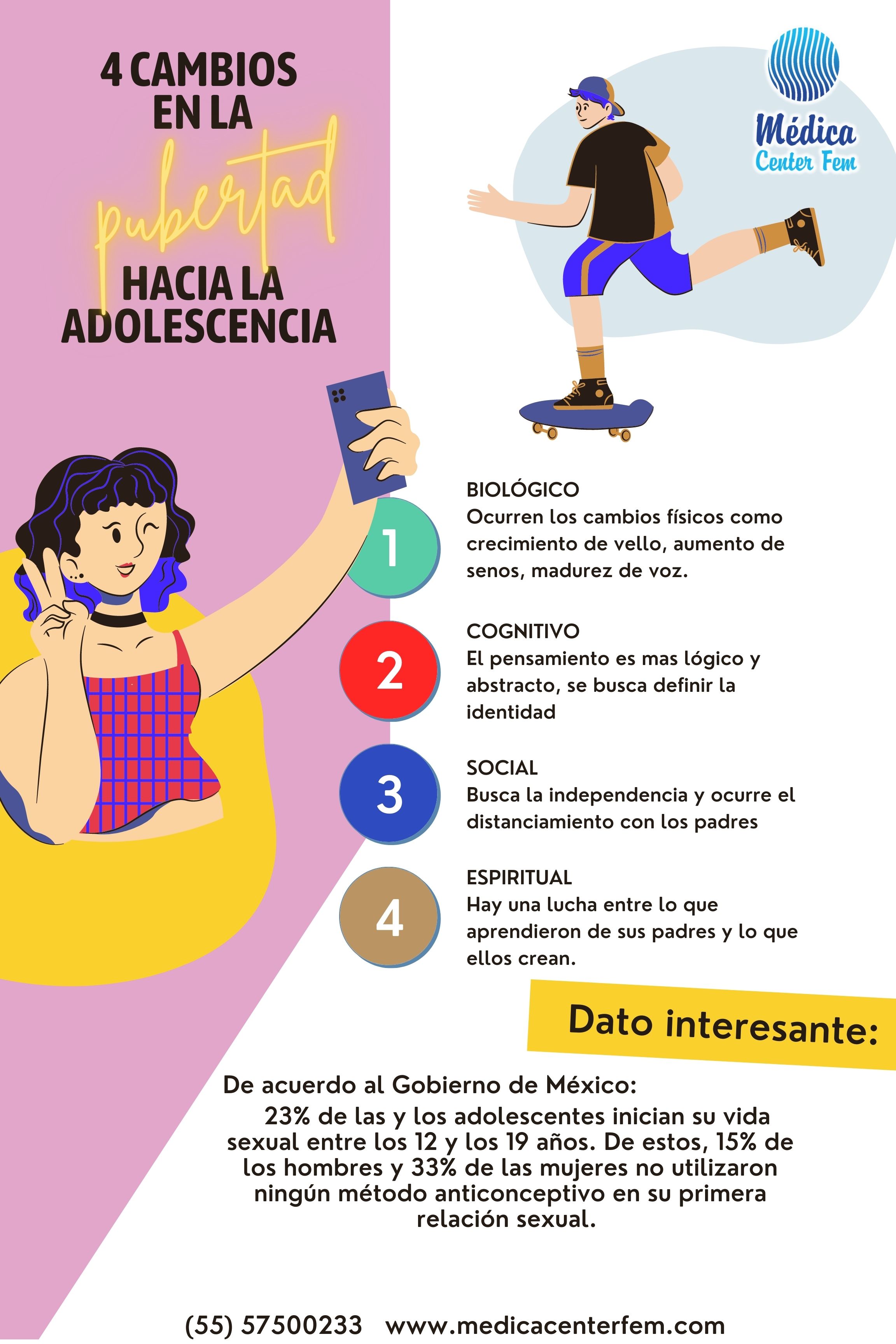4.Sexualidad: Llega el periodo menstrual, la presencia del flujo vaginal, la presencia de acné. La información sexual en esta etapa es vital, ya que de acuerdo a la OMS el embarazo en la adolescencia representa un 11% a nivel mundial.