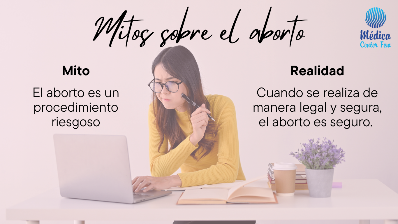 Mitos sobre el aborto. Existen muchos mitos y desinformación en torno al tema del aborto, por ello aún llega a existir el miedo pensando que es un procedimiento peligroso siendo que es todo lo contrario. Es importante abordar estos mitos con información precisa y basada en evidencia para fomentar una comprensión más clara y objetiva. A continuación, algunos de los mitos comunes sobre el aborto: