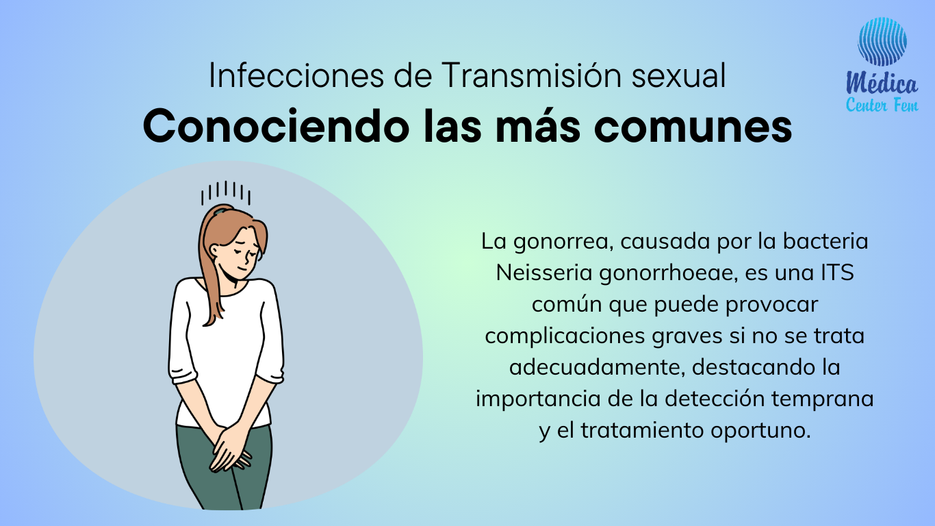 La gonorrea es una ITS causada por la bacteria Neisseria gonorrhoeae. Se transmite principalmente a través del contacto sexual vaginal, anal u oral con una persona infectada. Los síntomas pueden incluir secreción uretral o vaginal, dolor al orinar y dolor en la parte baja del abdomen.