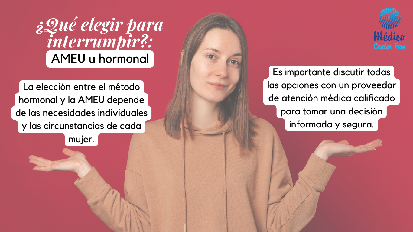 En última instancia, la elección entre el método hormonal y la AMEU depende de las necesidades individuales y las circunstancias de cada mujer. Es importante discutir todas las opciones con un proveedor de atención médica calificado para tomar una decisión informada y segura.