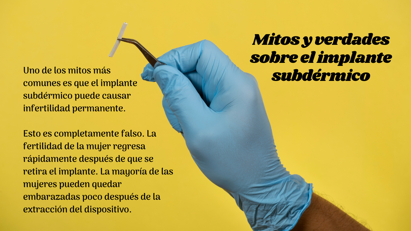 Uno de los mitos más comunes es que el implante subdérmico puede causar infertilidad permanente. Esto es completamente falso. La fertilidad de la mujer regresa rápidamente después de que se retira el implante. La mayoría de las mujeres pueden quedar embarazadas poco después de la extracción del dispositivo, lo que demuestra que este anticonceptivo no tiene efectos duraderos sobre la capacidad reproductiva.